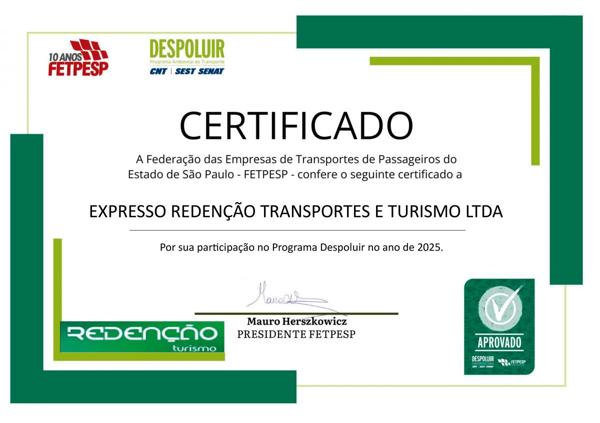 A Redenção Turismo recebeu o Certificado Despoluir 2025 após obter 100% de conformidade ambiental na Inspeção Técnica Ambiental Veicular (ITAV), realizada entre os dias 27 e 31 de outubro pela Federação das Empresas de Transportes de Passageiros do Estado de São Paulo (FETPESP), em parceria com a CNT e o SEST SENAT. O resultado destaca a empresa como uma das operações mais alinhadas às práticas de sustentabilidade e controle de emissões no transporte de passageiros do Estado.